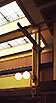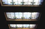 しかし中に入ると、そこにはライト独特の幾何学的な装飾がほどこされ、ガラス屋根の下に嵌められたステンドグラスから落ちる光に満ち、まことに美しいインテリアとなっている。