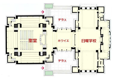 ホワイエ(玄関)と、ユニティ・ハウスの日曜学校