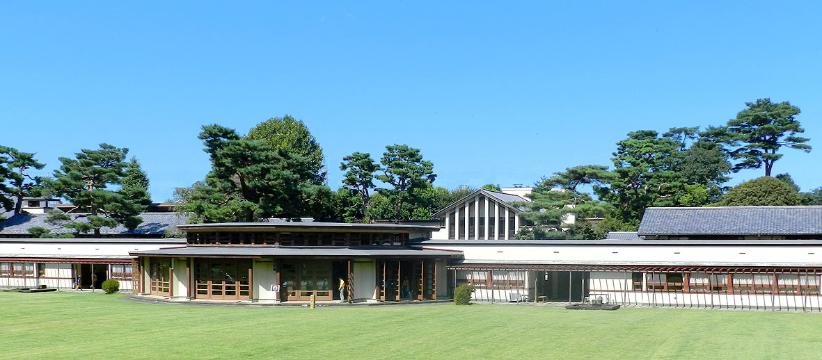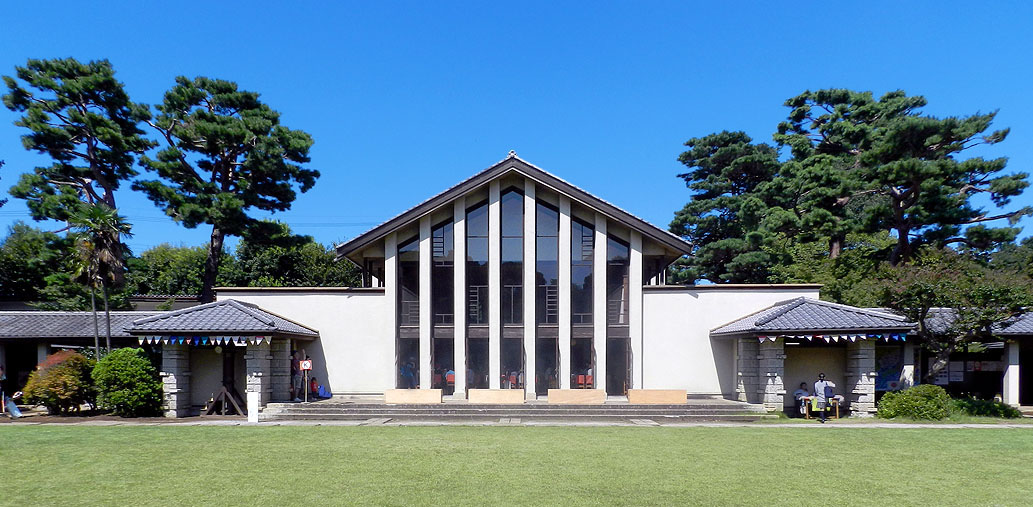 ![]() 南沢のキャンパスの中で一番広く、堂々としているのが、女子部エリアです。中心軸上に体操館、芝生中庭、食堂を並べ、その左右に2棟ずつ教室棟を配しています。このプランも、平等院鳳凰堂 ー 帝国ホテル ー 明日館 の系列にあると言えます。左側の講堂だけが左右対称から外れ、後からの付加のように見えてしまいますが。