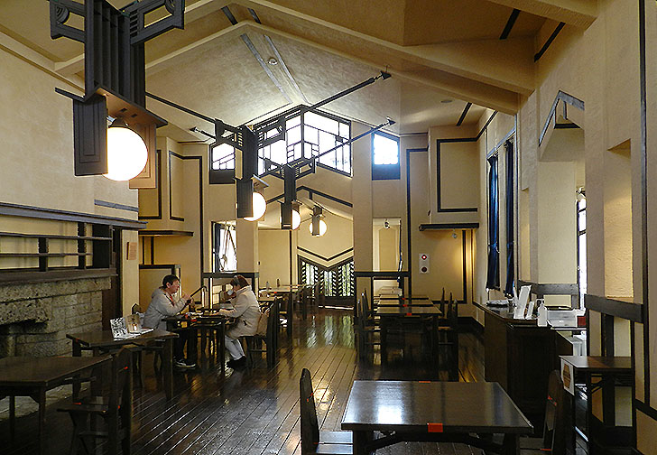 つまり日本人でライトの直弟子だったのは6人いたわけですが、遠藤新は一番古く、しかもライトが 帝国ホテルの仕事のために日本に滞在していた時の助手を ずっと務め、ライトの帰国の後は 工事の最後まで責任を持って携わったのですから、6人の日本人弟子の中でも 特別な存在だったわけです。 遠藤は田舎の出身でしたが 学業優秀で、支援者にも恵まれて 仙台二高から 東京帝国大学に進み、工学部(当時の 「工科大学」 )の建築学科に進学しました。主任教授だった伊東忠太の教えを受けたわけですが、ウマは合わなかったようです。建築界の大御所たる辰野金吾の東京駅に対しても 批判論文を書いています (1915)。「建築界の異端児」になる萌芽だったでしょう。学生時代に麹町の富士見教会で洗礼を受けましたが、必ずしも 熱心なクリスチャンではありませんでした。しかしこの教会で 羽仁吉一と 羽仁もと子夫妻の知遇を得たことが、将来 この夫妻が創立することになる「自由学園」の仕事につながります。 フランク・ロイド・ライトが 帝国ホテル新館(二代目 本館)の建築家に選ばれ、設計の完成作業のために来日したのは 1917年(大正6年)のことでした。帝大で「ホテル計画」を卒業設計とした遠藤新は、学生時代の大正2年に 渡辺譲の設計になる 古典様式の 旧・帝国ホテルを訪れ、支配人の 林愛作の知遇を受けていました。遠藤はライトの仕事に興味と共感をもっていたようで、新しく建てられるライトの新館に 期待していたのでしょう。新館の設計者にライトを選んだ林は、来日したライトの助手を求めて採用試験をしたようで、受験した ひとりの 遠藤新を採用しました。遠藤は 明治神宮造営局勤務の仕事をやめ、ライトの助手(ドラフトマン)として3ヵ月間、ライトに しごかれながら 製図に没頭することになります。