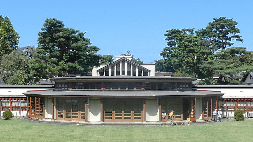 屋根の上に、中庭の奥の 背の高い食堂が見える。