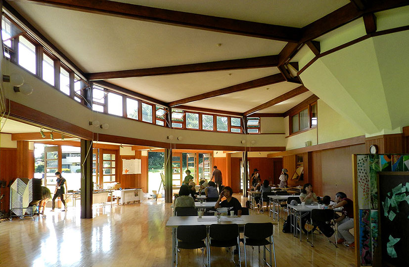 天井に 放射状の梁が顕され、右手の壁の背後が 更衣室になっている。
