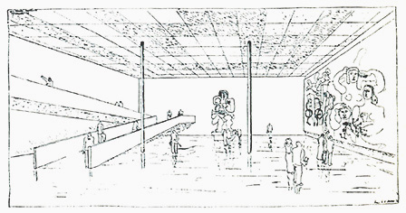 1937年のプロジェクト C「現代美術センター」のための このスケッチは、国立西洋美術館の中央にある「19世紀ホール」の オリジナル・コンセプトである。 (柱が鉄骨造のように細いが2本立ち、2階の展示室に上る斜路を設け、トップライト天井から採光する)
