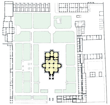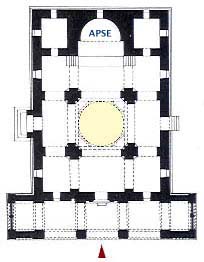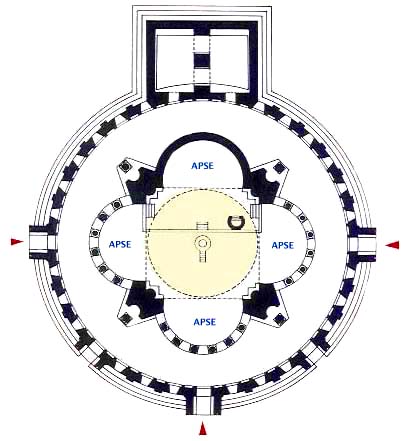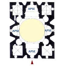 プランは一見 複雑に見えるものの、実は これも シンプルな長方形の外郭をしていて、4つのアプスの脇の外部に それぞれ深い切り込み(ニッチ)を設けて 外観を彫塑的にした 最初の作例なのである。