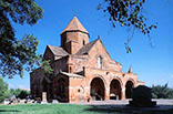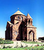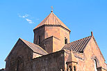 ![]() ![]() 聖ガヤネー聖堂、ヴァガルシャパト こうした 幾何学的な方法は、角錐(あるいは円錐)屋根を除けば、ヨーロッパのロマネスク建築(11、12世紀)と きわめてよく似ている。 ロマネスク建築の源流のひとつが アルメニアにあるとされるのは、このせいである。そして、壁から屋根の頂部に至るまで すべて現地の 赤みを帯びた凝灰岩で作られたその姿は、簡素でいながら 表情豊かであり、「建築の原型」とも言うべき 清々しい印象を与える。( PC.2, OK.110, MH.48, EC.157dr, 351-3 )