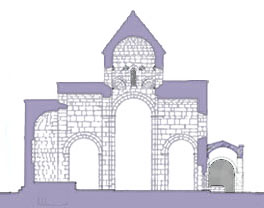 その大聖堂にエチミアジン(神の独り子の降誕地の意)の名がかぶせられたのは 10世紀のことらしいが、ソ連時代の 1945年からは、これ(エチミアジン)が ヴァガルシャパトに代わって 都市の名前ともなった。独立後の 1995年には 再び ヴァガルシャパトの名に戻されたのだが、人々は今でも この町を エチミアジンと呼ぶことが多い。 現在は 人口6万人ほどの都市で、聖エチミアジン大聖堂を中心とする 宗教都市であるが、巡礼者は 大聖堂とともに 聖フリプシメ聖堂と 聖ガヤネー聖堂にも お参りをする。 聖エチミアジン大聖堂の立面図
