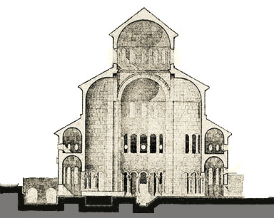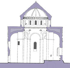 聖ガヤネー聖堂の 平面図と断面図 その単純さにもかかわらず 外観が立体的な姿をしているのは、長方形の外郭の中に 十字架プランを浮き上がらせて、十字架の それぞれの腕の部分に 切妻屋根を架け、交差部には高いドーム天井を載せ、その塔状部の外観を 八角形のドラム(胴部)と 八角錐の屋根で構成しているからである。