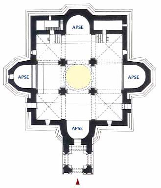 聖エチミアジン大聖堂の 平面図 聖エチミアジン大聖堂のほうは、当初の建物は 聖ガヤネー聖堂と同じように バシリカ式であったと考えられるが、ペルシアによって破壊されたあと、5世紀の再建で 現在のようなプランになり、後のアルメニアの聖堂建築の 原点となった。それは 正方形プランに十字形が重ねあわされ、中央の交差部に 八角錐の屋根をいただく ドーム天井を架するとともに、十字形の四方にアプスを配して、単なるギリシア十字とは異なった 「四アプス形式」 にしたことである。実際には 東側のアプスにのみ 祭壇が置かれ、西側のアプスは 入り口になっているのだが、この集中式の 四アプス形式が、アルメニアに独特な聖堂建築を 発展させることになる。
