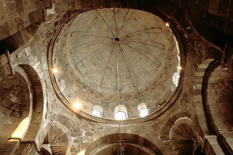 聖フリプシメ聖堂の堂々たるドーム天井。 四方のアーチと四隅のスキンチの上にドーム天井が載る。 ドームのリブは3本づつ束ねられて、全体で十字架を構成している。 その下には32のメダリオンが一列に並んでいるのが、珍しい装飾である。 ドラムの下には、カトリケーと同じように、円周にバルコニーが巡っている。