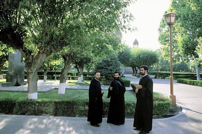 Monks in the precincts of Surp Echmiadzin Cathedral, Vagharshapat. "Echmiadzin" means "Descent of the Only Begotten".
