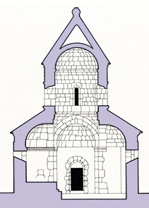 ガヴィットはほぼ正方形プランに交差アーチをかけて、天井を9ベイに分割している。入口は西側ではなく南側にもうけられている。中央ベイはスカイライトのあるイェルディクで、石造 ラテルネンデッケ天井になっている。木造の「ハザラシェン Hazarashen」天井を石造に置き代えた構造であるが、このシステムが、 多くのアルメニア建築研究者が主張した、アルメニアの石造ドームの起源であるとは 考えられない。持ち出し構造 (Corbeling) が 真のドームを生んだりしないことは、インド建築の歴史を見れば よくわかる。( PC.166 )