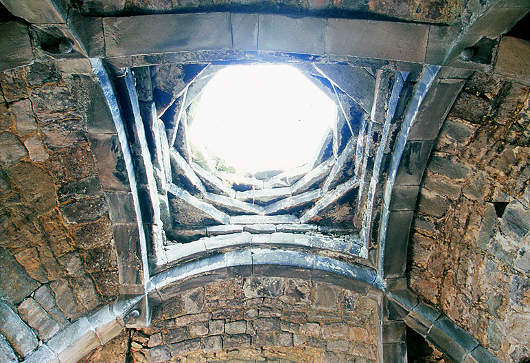 ゲタシェンの アラケロツ修道院(ヴァンク)、ガヴィットの 石造 ラテルネンデッケ天井 The ceiling of the Arakelots Vank at Getashen. ジョージア(グルジア)の木造民家のハザラシェン天井 これが 真のドームになることは、絶対にない。 (トビリシの野外民俗博物館、アハルツィヘ からの移築民家内部)