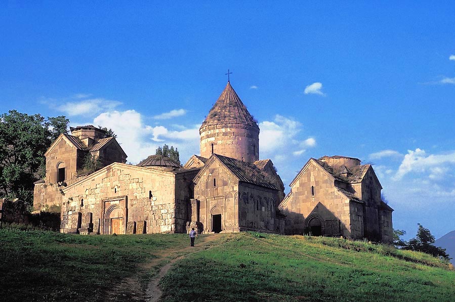 ゴシュの ゴシャ修道院(ヴァンク)、12〜13世紀 丘の低部から見た夕景。 聖アストヴァツァツィンの周囲に諸堂が並ぶ。 初めてアルメニア本土に行った時の 最初に訪れた 古いヴァンクであり、 インドのヒマーチャル地方のような植生の山野を通り抜け、 広い境内の なだらかな丘の上に建つ建物群のアンサンブルに感動し、 アルメニアで 私の最も愛するヴァンクとなった。 夕陽に照らされた この「群造形」の光景に深く魅了されて 忘れられず、3年後にまた訪ねた。