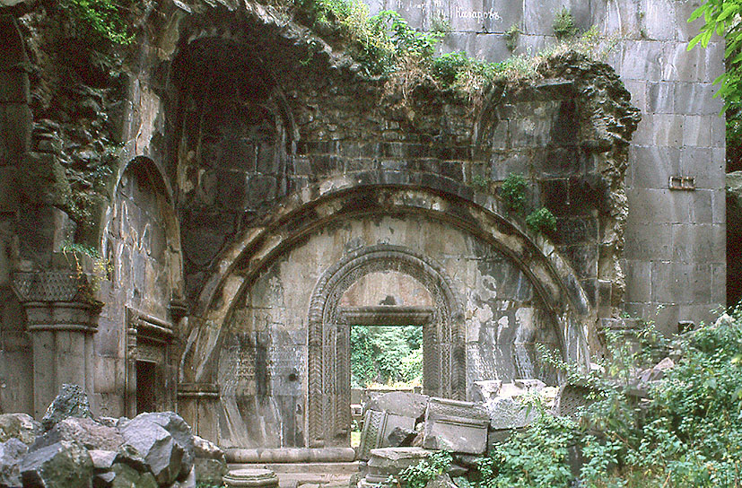 コバイル修道院(ヴァンク)、12世紀。 主聖堂 の入口 左は ザカリア家のチャペル。 両者の共通ポルティコ(ガヴィット)は、 アーチのみを残して 屋根と柱が失われてしまった。 扉口の右の壁面には、ジョージア語の碑文がある。