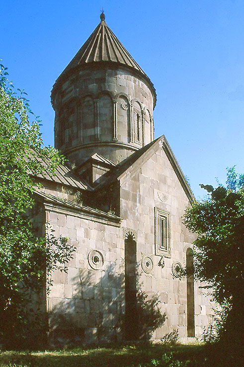 マカラ修道院(ヴァンク) 聖マカリオ聖堂の南面、1205年 窓の上に日時計、窓の下に鳥の彫刻と、丸窓が3つ並んでいる。 The church of Surp Makario in Makara Vank, 1205