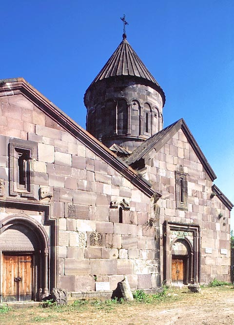 マカラ修道院(ヴァンク)、12〜13世紀 アーチの門をくぐって行くと、真っ先に この姿が目にはいる。 13世紀の共用ガヴィットと、右奥の聖マカリオ聖堂(1205)のファサード。 Makara Vank near the village of Achajur.