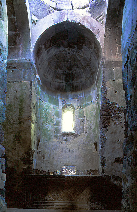 マカラ修道院(ヴァンク)、9〜10世紀 アルカイックな古聖堂の内部 祭壇 dais 床の側面は、菱形パターンの中に植物紋様のレリーフが彫刻されている。 Makara Vank near the village of Achajur.