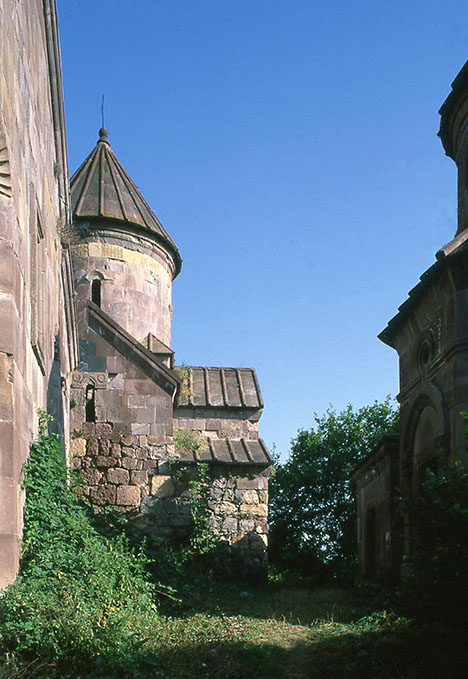 マカラ修道院(ヴァンク)、9〜10世紀 アルカイックな古聖堂を南側から見る。 左端は聖マカリオ聖堂、右側はスルプ・アストヴァツァツィンの小聖堂。 古聖堂の下部は創建時の荒い石積み、塔状部は1970年代の修復。 Makara Vank near the village of Achajur.