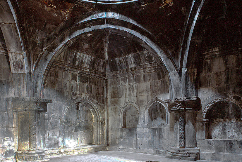 サナヒン修道院(ヴァンク) マテナダラン(図書室)の内部 各壁面の中央にある特異な意匠の柱が 対角上のアーチを受け、 アーチとアーチの間の曲面三角形が ペンデンティヴをなしている。 Interior of the Matenadaran (Library), Sanahin Vank.