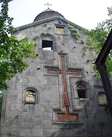 サナヒン修道院(ヴァンク)の鐘楼、1211〜1235 3階建ての西壁面に大きな十字架 屋根の上にロトンダの鐘楼が立っている。 A small chapell of Resurrection with a Khatchkar.