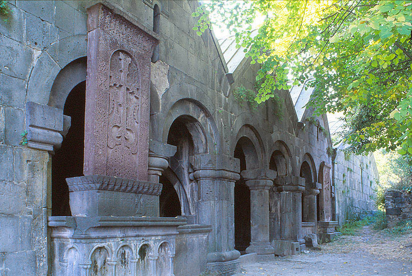 サナヒン修道院(ヴァンク) 共用ガヴィットのファサード 手前にハチュカル(十字架石)、奥に聖アメナプルキチュ聖堂。 The common Gavit in the monastic complex of Sanahin Vank.