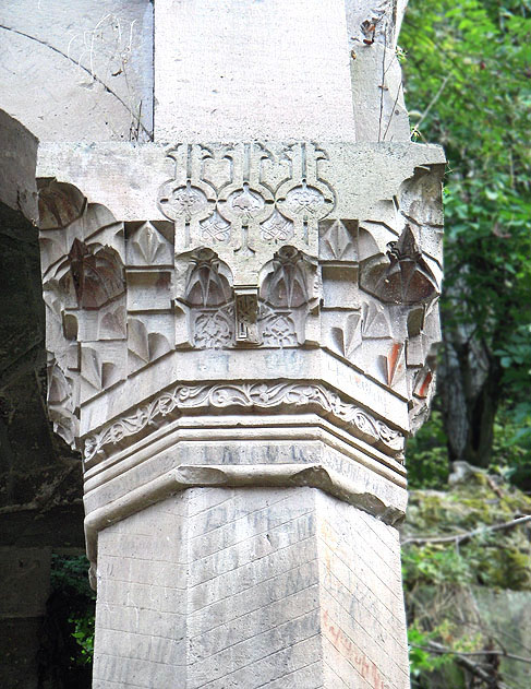 バルツラカシュの聖グリゴール聖堂遺跡 聖堂の柱頭のひとつ。 ムカルナスに加えて、さまざまな意匠のレリーフ彫刻が ほどこされている。 One of the elaborately carved capitals in the church of Surp Grigor.