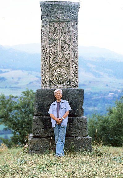 トゥマニアンの村から野を行くと、みごとなハチュカルが残る。 背後は デベド峡谷の深い断崖。 A large khachukhal left near the gorge of Tumanian village. 昔 ソ連大使館でもらった小冊子『アルメニアの建築 モニュメント (Armenian Architectural Monuments) 』に1ページ大で G・アヴァキアン (G. Avakian) の線画が載っていたので 見に行った。