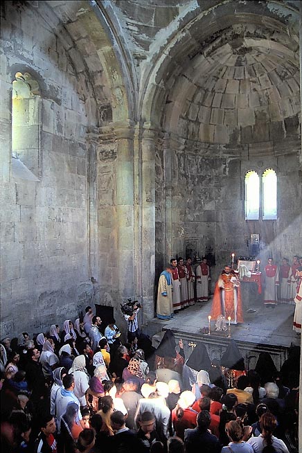 ノル・ヴァラガ修道院(ヴァンク)での 日曜日のミサ 西方カトリックの聖堂と異なって、東方教会の聖堂では、信者は 立ったままミサに参加する。 ベンチに座って礼拝するカトリックに 比して、礼拝室面積が小さく、奥行きが浅い理由である。 A mass on Sunday in the Nor Varaga Vank in Varagavan.