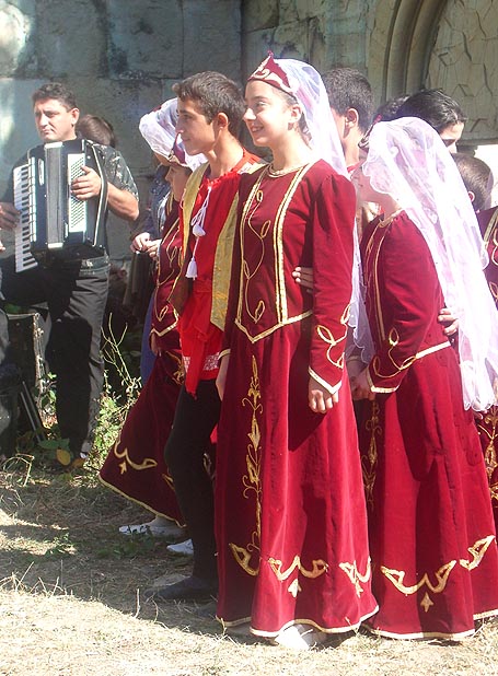 ノル・ヴァラガ修道院(ヴァンク)での 日曜日のミサ この日は何かの祭礼で、境内で若者たちの民俗的なダンスをやっていた。 Young folks for traditional danses at the Nor Varaga Vank on a festival.