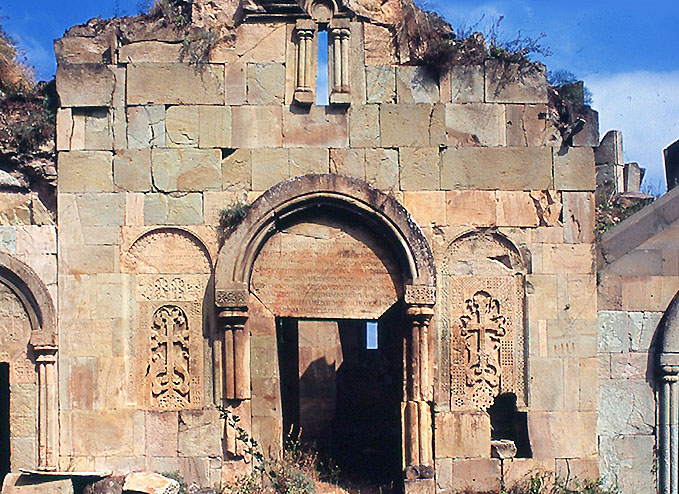 ヴァラガヴァンの近くの山上にある ノル・ヴァラガ修道院(ヴァンク) 副聖堂のファサード、この奥に3堂が並んでいる。 ポーティコの両脇にハチュカルが、タンパンには碑文が彫刻されている。 The Nor Varaga Vank in Varagavan.