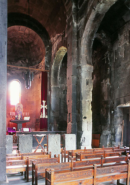 アパランの カサフ・バシリカ(聖十字架聖堂)内部、4世紀 初期のアルメニア聖堂には、このように馬蹄形アーチが用いられていた。 当初の石の部材は、風化が甚だしい。 前面に残る4つの石は、内陣と信者席の境をなしていたらしい。