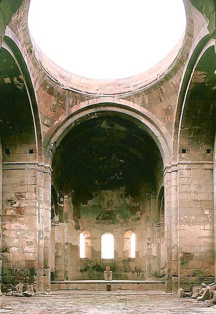 アルッチの聖グリゴール聖堂の堂々たる内部。 ドラムとドーム天井は失われたまま。 アプスの半ドーム天井には、ヨハネ福音書からイエスと12使徒の壁画が描かれていた。 ステパノス (Stepannos) という画家にょって666年に描かれたというが、いまはほとんど剥落している。 アプスの壁に3つも大きな窓があるのは きわめて珍しい。