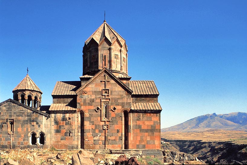 オハナヴァンの ホヴハナ修道院(ヴァンク)、13世紀 聖ヨヴハネス聖堂とガヴィットの南面。 右側は深い峡谷 ドラムの装飾法は、ハリチのハリチャ修道院のカトリケーに倣ったという。 The Hovhana Vank at Ohanavan.