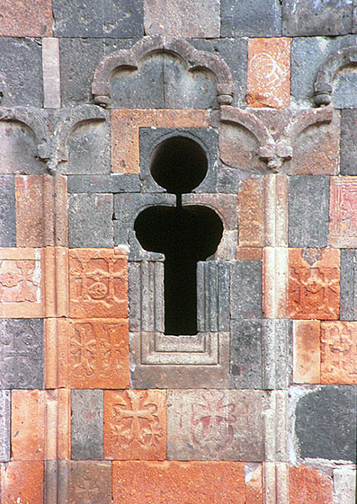 オハナヴァンの ホヴハナ修道院(ヴァンク) 聖ヨヴハネス聖堂。 西壁面と小窓 五弁形アーチと小窓の中心軸が合っていない。 周囲に多くの十字架が刻まれている。 The Hovhana Vank at Ohanavan.