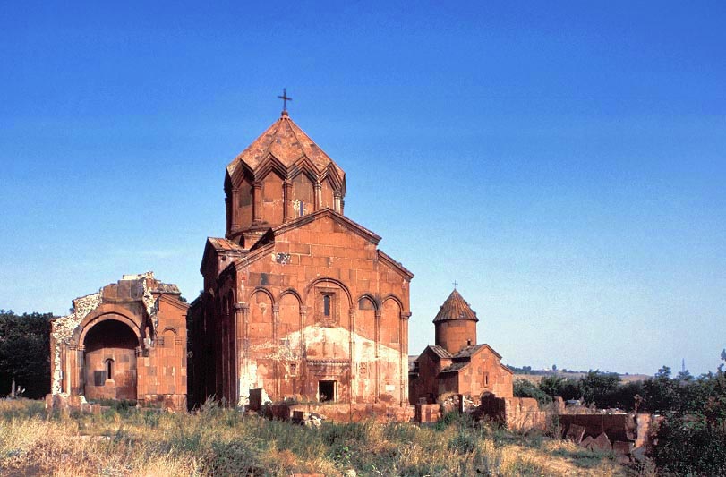 マルマシェン修道院(ヴァンク)、10〜14世紀 夕陽に照らされた、並列する 半壊の北聖堂とカトリケー(カテドラル)、南聖堂。 カトリケーの前面のガヴィットおよび、さらに前面にあった円形聖堂は失われてしまった。 The Marmashen Vank in Marmashen.
