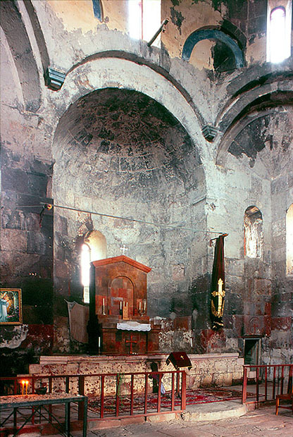 マスターラの聖ホヴハネス聖堂、内部 スキンチを四方の大アーチに近いくらいに大きくして連続させているのは、 イスファハーンのシャイフ・ロトフォッラー・モスクを思い出させる。 Surp Hovhannes at Mastara