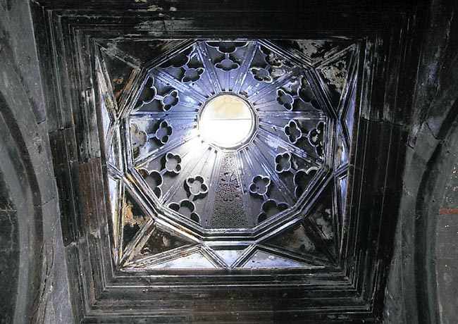 サグモサ修道院(ヴァンク)、ガヴィットの天井、スカイライト 正方形プランを円形(12角形)に変える移行部の構成は、トルコ式三角形に近い。 The Saghmosa Vank at Saghmasavan.