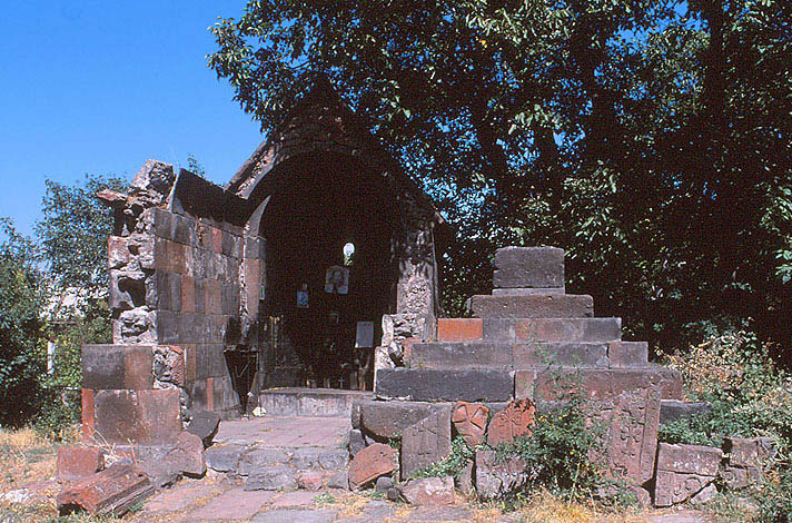 アヴァンの 聖母(アストヴァツァツィン)聖堂遺跡 初期の小聖堂で、1873年に再建されたが、さらに破壊。 切妻屋根の架かったアプス部分のみが残っている。 右手に見えるのは、かつて立っていた もう1本の独立柱の 階段状基壇。