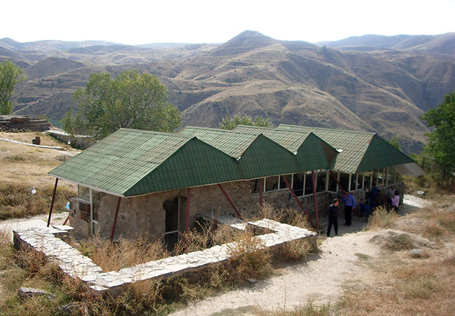 神域内の、3世紀のローマ浴場の遺跡。外壁の上に仮設の屋根が架けられていた。 内部は仮設の通路などが作られていて、うまく写真が撮れない。 かつては床や壁にモザイク画があった。