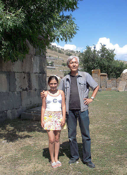 フラズダンの マクラ修道院聖堂を管理している隣家の娘、 外国に憧れて英語を勉強している 11歳の マリーアと。 左が小聖堂。奥は かつての墓地で、ハチュカルが並んでいる。 ( September 1, 2008 )
