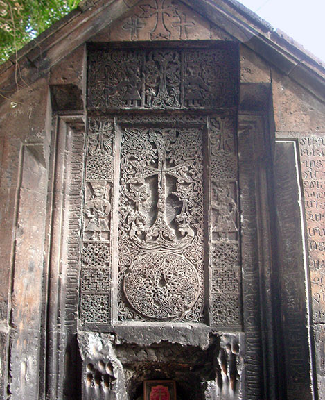 中央の十字架の両脇と、上部の十字架の両脇に人物が描かれている。