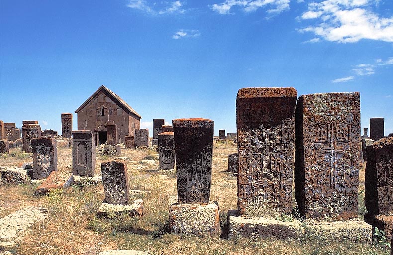 古いハチュカル(十字架石)群と、小さな墓地聖堂