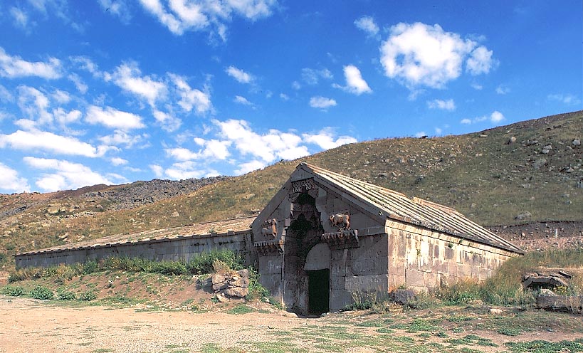 セリム(スレマ)峠 の 隊商宿(キャラヴァン サライ)、14世紀 L字形のプランで、手前の短い棟がエントランス・ホールで、奥の長い棟が宿泊室。 Caravanserai at Selim (Sulema).