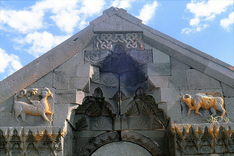 ファサードの石彫、イスラミックなムカルナスと、動物(キマイラと雄牛)