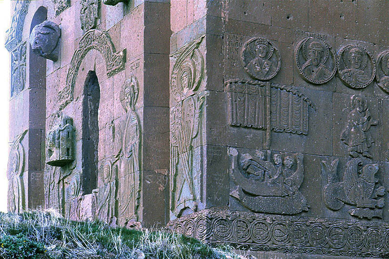 聖十字架(スルプ・ハチュ)聖堂、南西コーナー部。 左側壁面に、ガギク王が捧げる聖堂の模型が見える。 その右側はキリスト、両端は 天使セラフィム。 右側壁面は、舟から海に投げ出されるヨナと、それを呑み込む大魚。