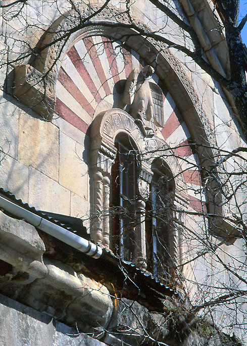 聖母聖堂の南側壁面上部、窓回り装飾。窓の上には「鹿を襲う鷲」が