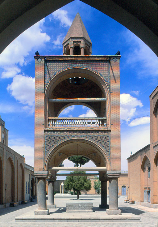 イスファハーンのヴァンク・カテドラルの鐘楼 フリー・スタンディングの塔を ピン柱で支えるというのは、 大いに地震が心配である。もしかすると、柱はRCなのかもしれない。 The belfry of the Vank Cathedral (Surp Amenaperkitch)