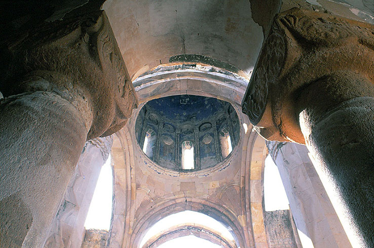 ジョージア渓谷の イシュハン・カテドラル、交差部、1032年 ドームどドラム(胴部)には壁画が残っていて、 ドームには 4人の天使が十字架を捧げもつ姿が描かれている。 ドームの高さは42メートルにもなる。 Ishhan Cathedral, 1032, 15c.
