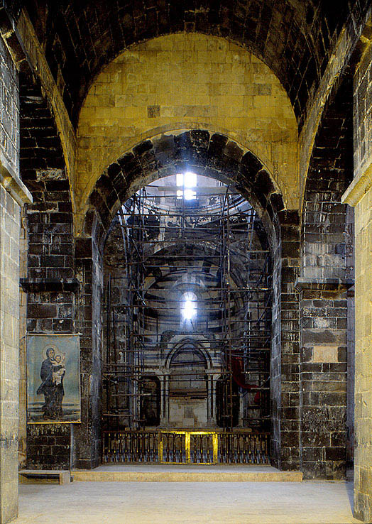 入口から 新聖堂を通して、古聖堂のアプスまで見通す。