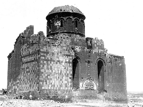 (参考) オーウズルの三アプス聖堂。 大きく崩壊する前の20世紀初めの姿。 南ファサードに入口上のタンパンが見える。屋根は円錐形だった。 (From "Les Arts Armeniens" by Jean-Michel Thierry, Msazenod, 1987)